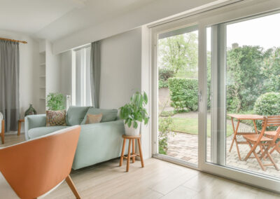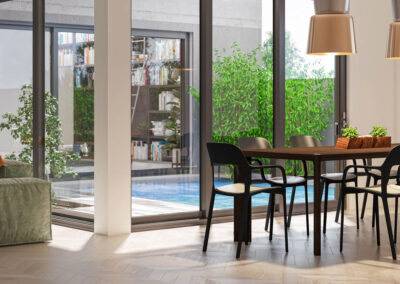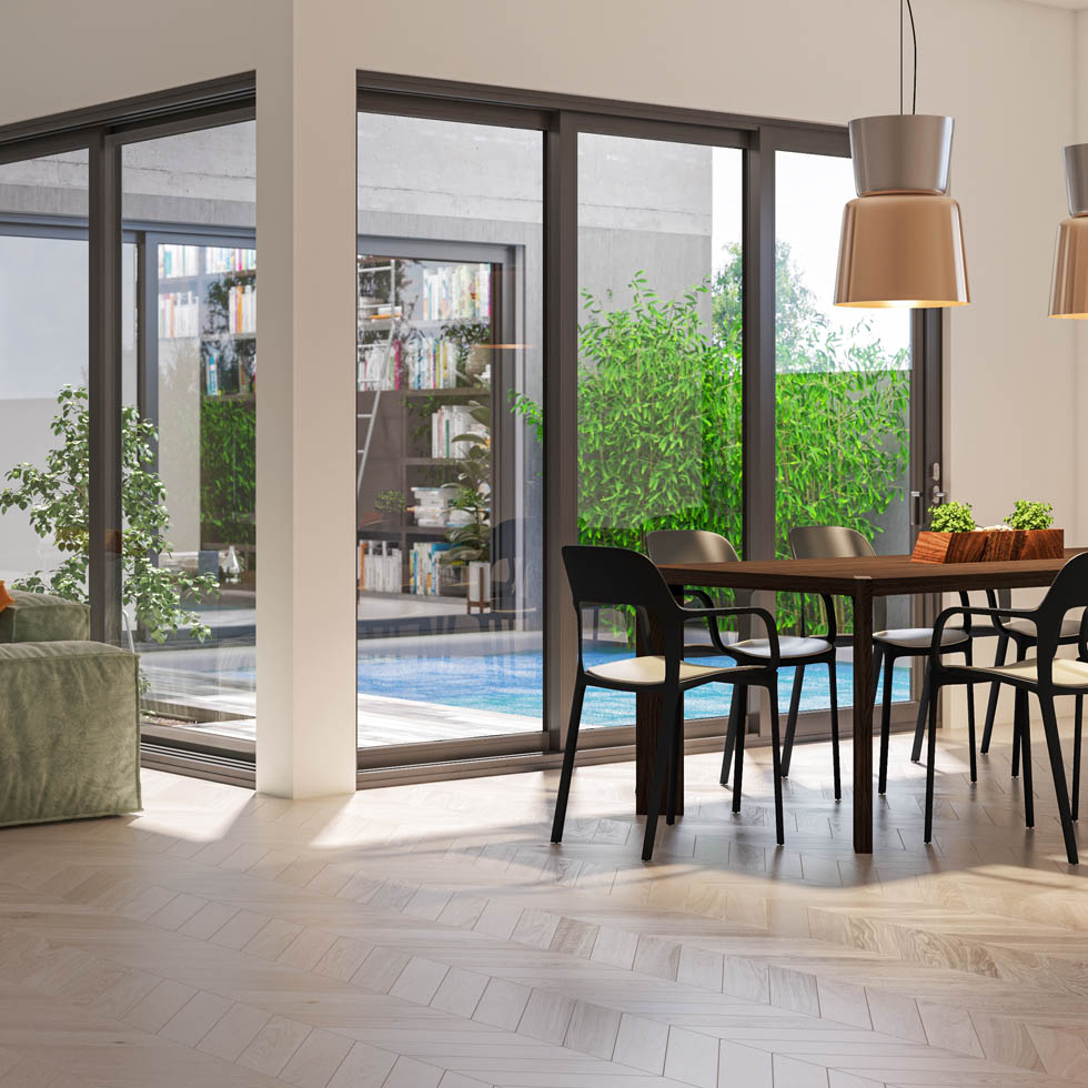 El CRS-77, un sistema de ventana corredera, permite la creación de puertas balconeras de dimensiones amplias, adecuándose a las tendencias actuales en arquitectura con un diseño simple que destaca por su reducido nudo central. Optar por carpinterías con secciones reducidas es ideal para cerrar espacios grandes, maximizando la entrada de luz y promoviendo una conexión visual más amplia con el exterior.